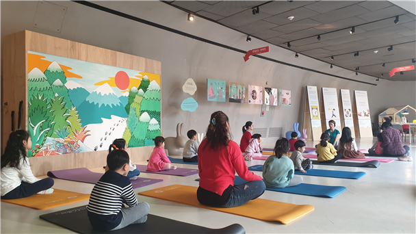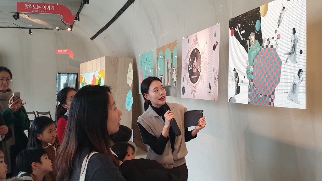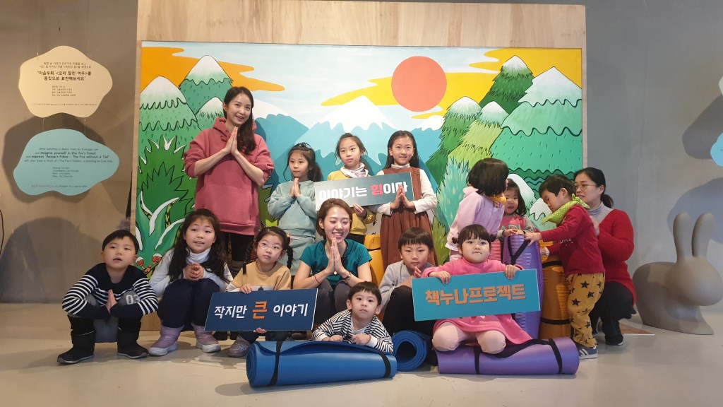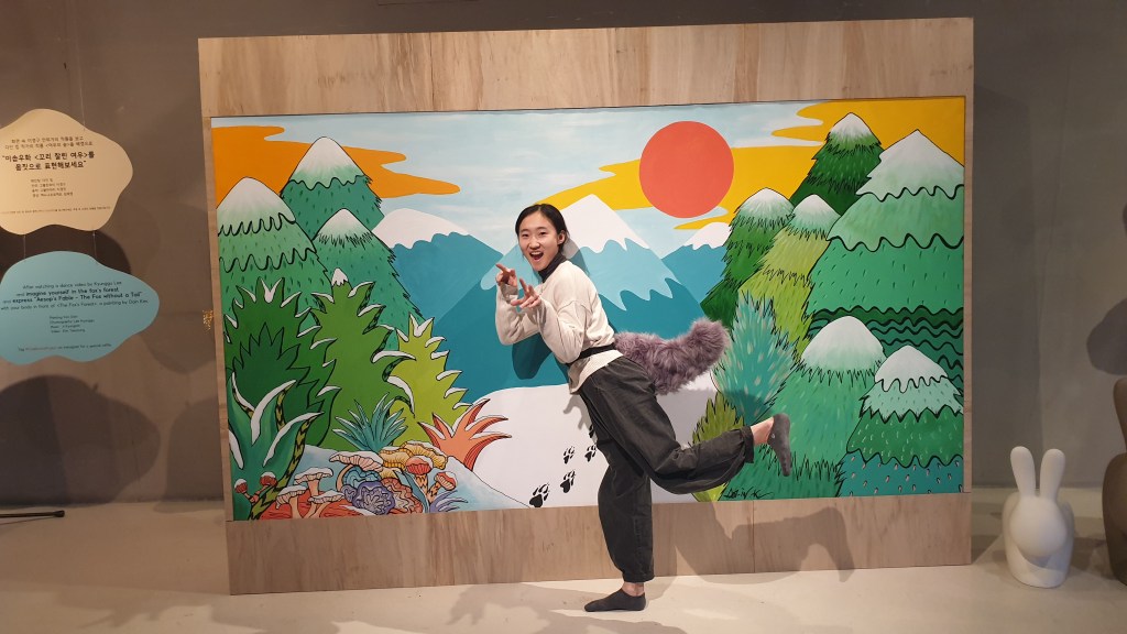 The first section of the exhibition ‘EXPRESS A STORY’ is where visitors can express a story with their bodies. On the first day of the exhibition, LEE Kyunggu, a contemporary dancer and a choreographer of the team Goblin Party showcased a contemporary dance piece <The Fox Without a Tail> based on a fairy tale by Aesop in front of the commissioned-painting <The Fox’s Forest> painted by Dain Kim, an artist based in Korea who mostly works on mural, illustration, live painting, design and other various genres using her unique traditional method mixed with tropical designs. The contemporary dance piece was exhibited in digital next to the painting throughout the exhibition period and visitors could watch and listen to the story in the video and express a story in front of the painting. A fake fox tail and cute performance props were exhibited for family visitors to make a fun photos as well. This section was also used for various other special programs to express stories with movement such as movement workshop with books, shadow theater, yoga workshop from Aesop’s fables, story theater, and so on to build a family-friendly environment.